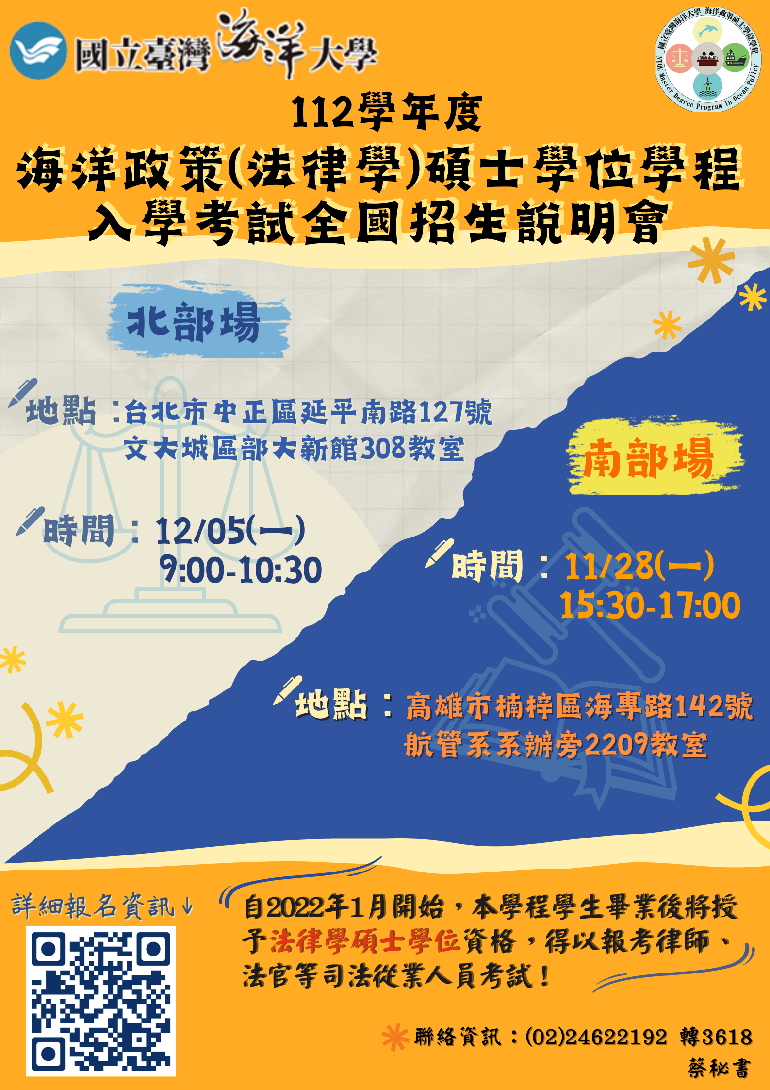 111學年度海洋政策(法律學)碩士學位學程第2次全國招生說明會。